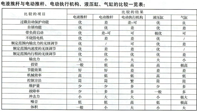電液推桿與電動推桿、電動執(zhí)行機構、液壓缸、氣缸相比,有如下優(yōu)點: